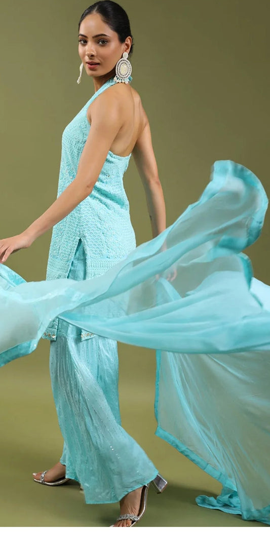 Handme Blue Floral Kurta With Sharara & With Dupatta